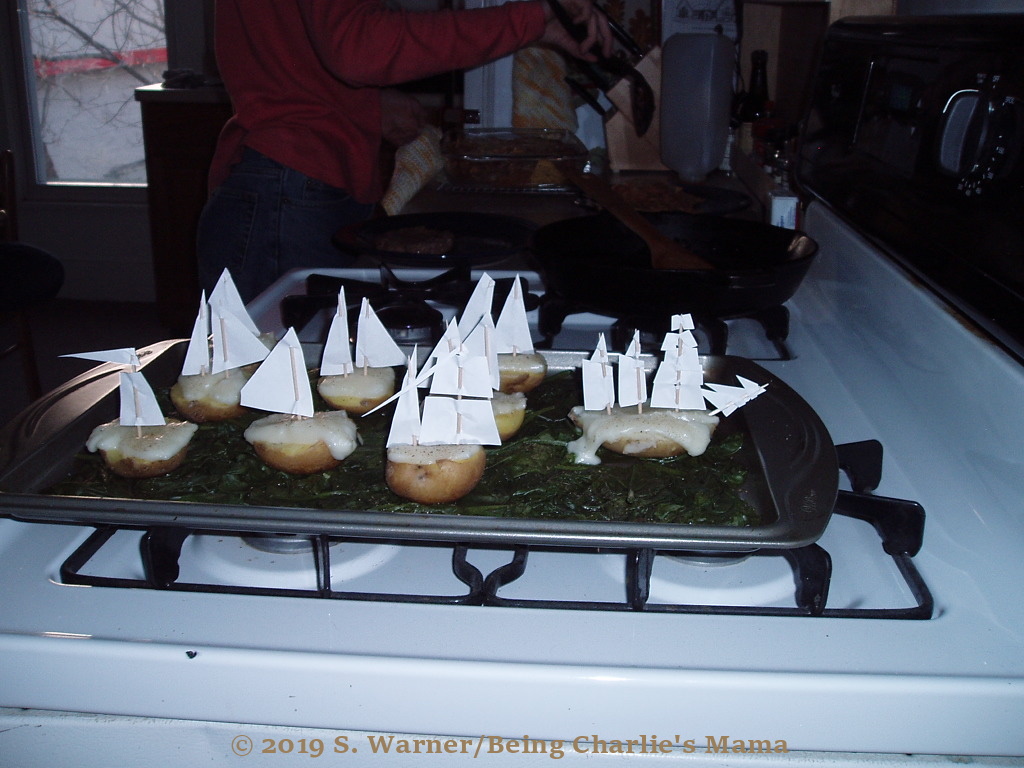 Spinach boats were a meal I looked forward to as a kid! The potatoes can be boiled or baked, but then cut in half, place a slice of cheese on top, and place in the oven to melt the cheese. In the meantime, cook spinach. When you arrange them on a plate, and add a triangle of paper on a toothpick for a sail, you have a boat on the weedy seas!